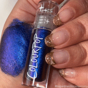 • ColourPop Chrome Liquid Shadow in Same Vibe displays a doe-foot applicator and a vivid swatch shifting blue to purple to pink, set beside a clear tube with white ColourPop logo and star-accented cap, highlighting the metallic multi-chrome finish. Same Vibe ColourPop Chrome Liquid Shadow swept across a closed eyelid in a sharp wing, showing a high-shine duochrome shift from violet to fuchsia with a blue‑teal sheen; smooth, opaque payoff in a close-up beauty swatch.