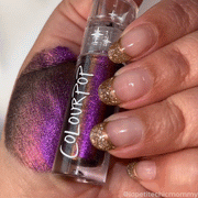 • Supernova ColourPop Chrome Liquid Shadow shifts purple to teal to gold, shown in a clear tube with ColourPop logo and star-detailed cap, doe-foot applicator, and a shimmering multichrome swatch on a white studio background. Supernova ColourPop Chrome Liquid Shadow shimmering multi‑chrome purple with a green shift, arcing above the crease and lining both eyes in a bold graphic look, shown in a close-up with glossy lips and a small gold nose ring.