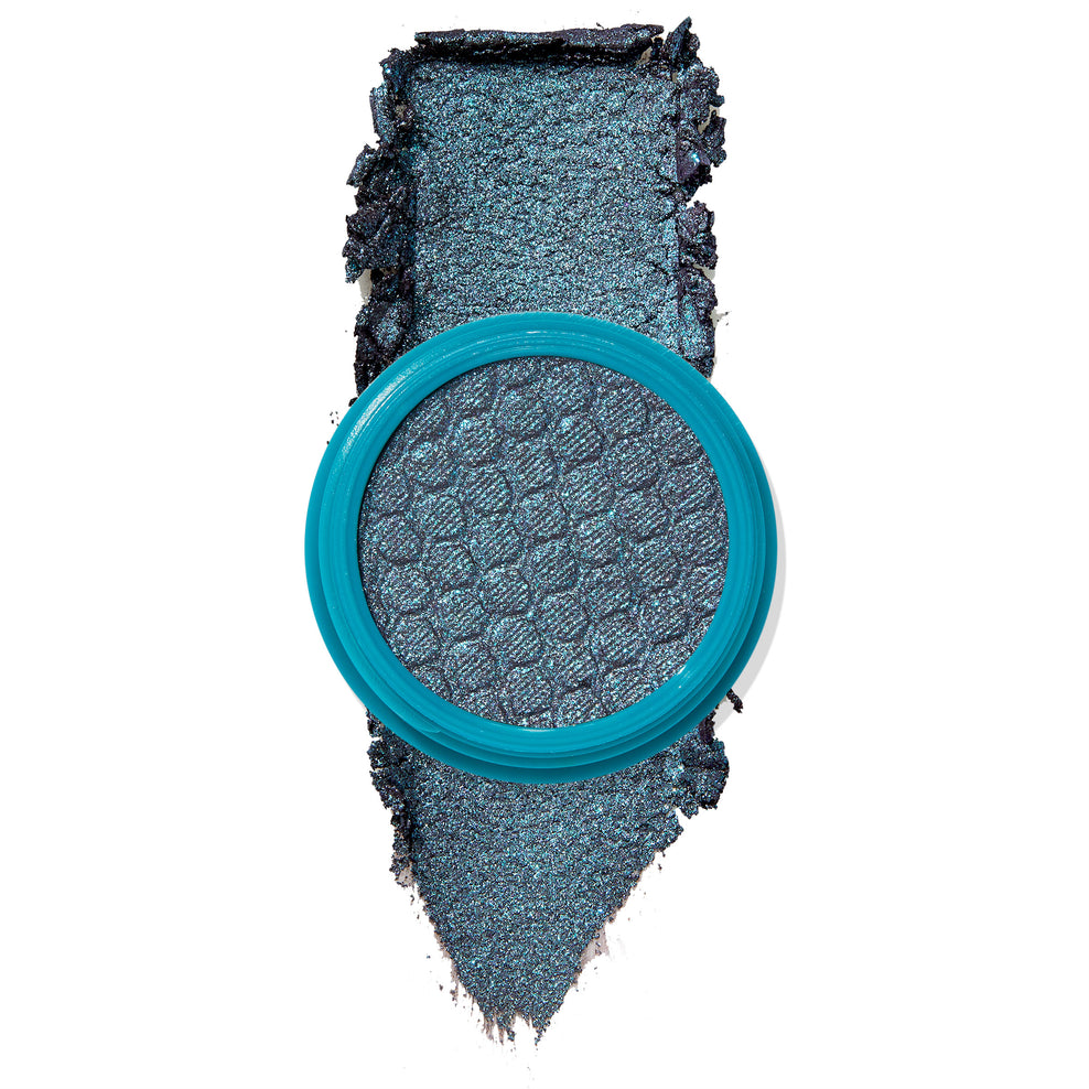 Frightful ColourPop Super Shock Shadow opens to reveal a charcoal-black cream shadow packed with teal sparkle, housed in a teal pot beside Disney Haunted Mansion box art, styled on a purple, cobwebbed background. Frightful ColourPop Super Shock Shadow swatch glinting teal-blue over a blackened base, spread in a vertical swipe with crushed sparkly edges on a white background, showcasing its metallic, high-shine eyeshadow finish. Frightful ColourPop Super Shock Shadow swatched on three arms - a shimmering deep navy with teal sparkle - shown beside other shades to display rich color payoff across light, medium, and deep skin tones. Frightful ColourPop Super Shock Shadow, a metallic charcoal eyeshadow with teal-blue sparkle, sits pressed in a round turquoise plastic pot with a dimpled texture, shown in a close-up on a white background.