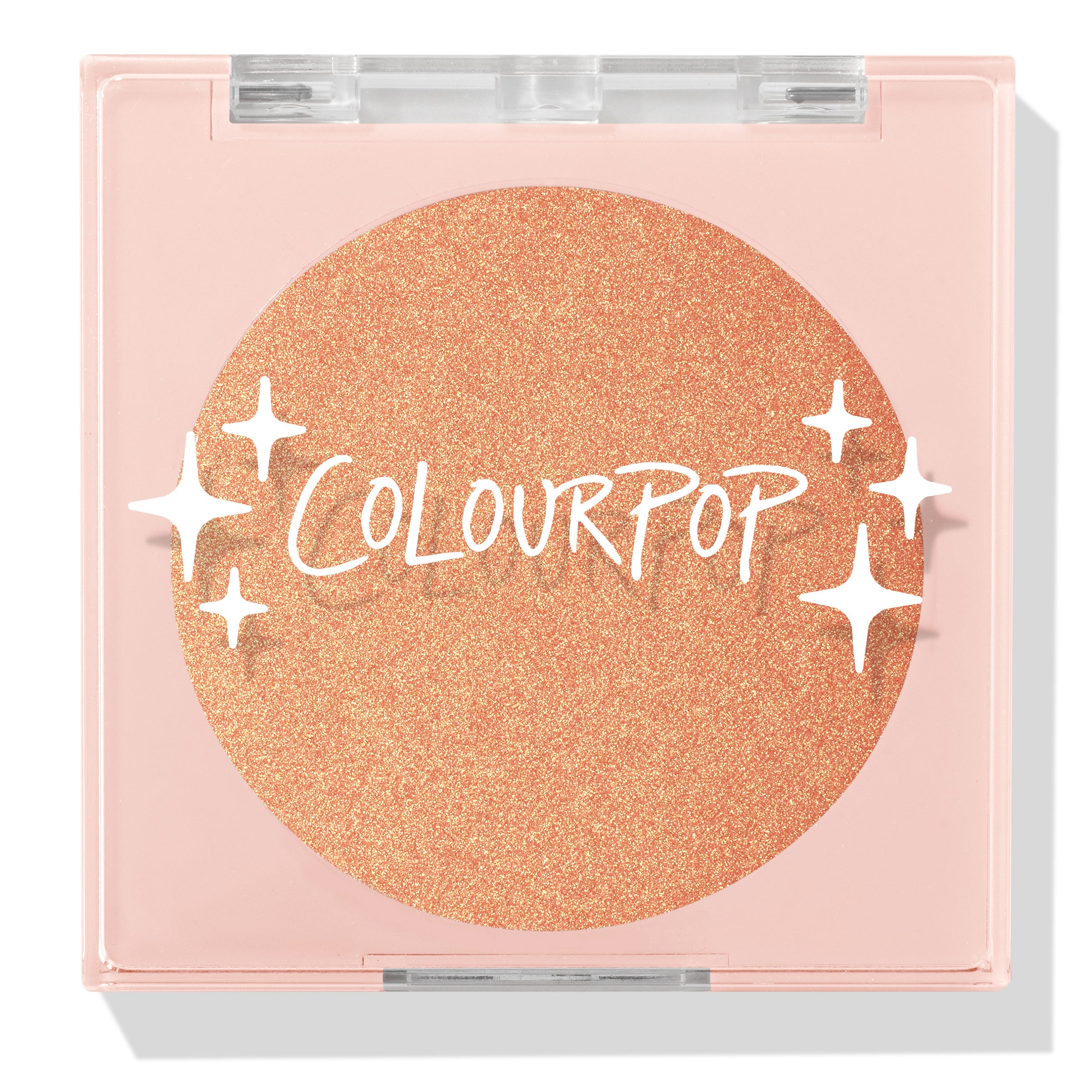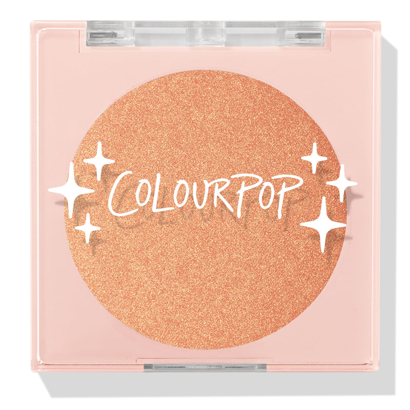 Boombox ColourPop Pressed Powder Highlighter displays a warm peach-gold shimmer pan in a pale pink compact with a half-open clear lid on a white background.