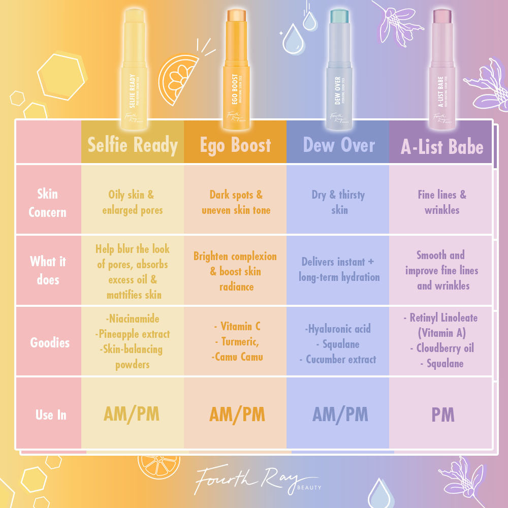 Ego Boost Serum Stick targeting dark spots and uneven tone with Vitamin C, turmeric, and camu camu, shown upright in orange packaging beside Selfie Ready, Dew Over, and A‑List Babe; AM/PM use; ColourPop Serum Stick by Fourth Ray Beauty.