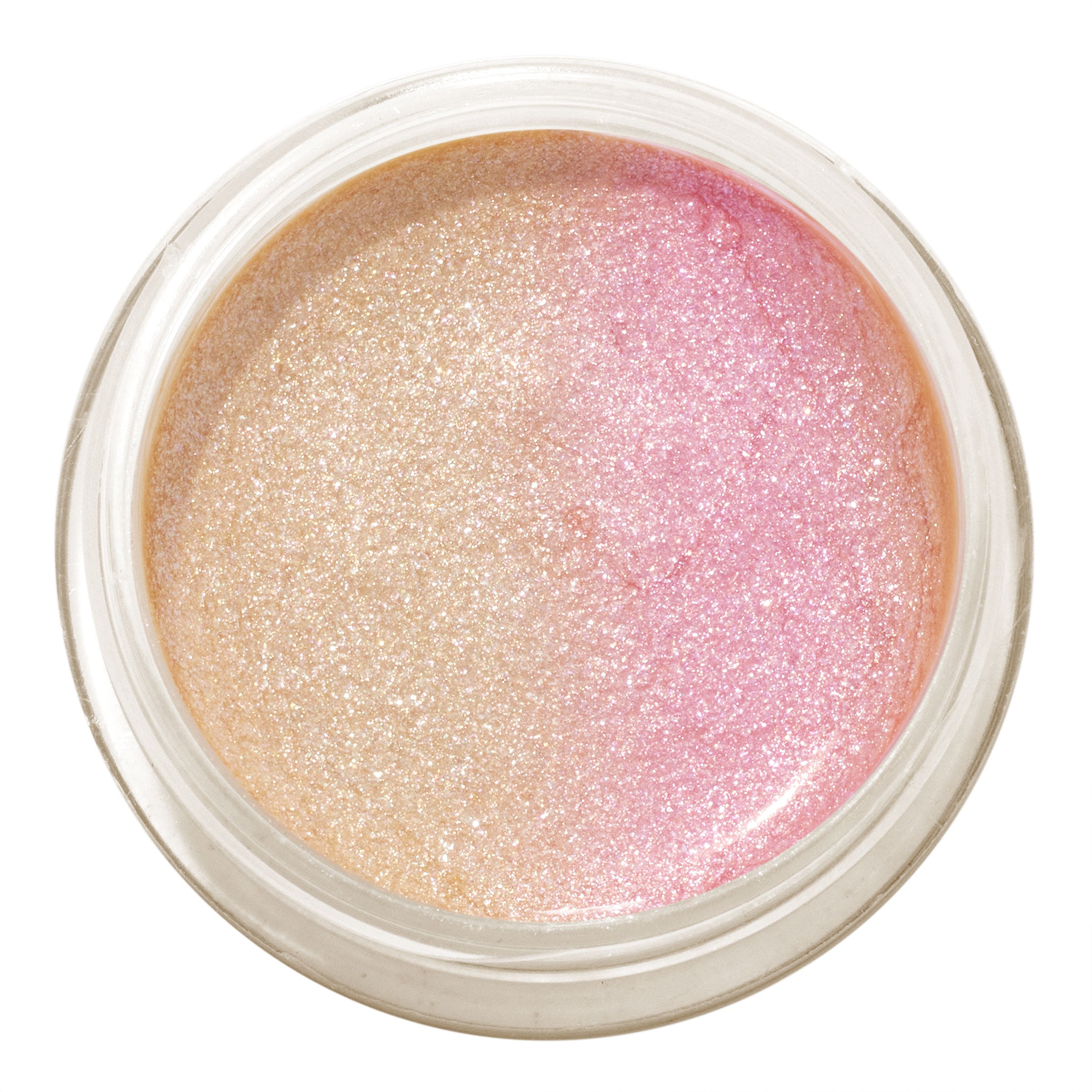 Field of Fairies ColourPop Jelly Much Shadow shows an open pot of pink gel eyeshadow with a gold shift, swatched in wide strokes on a blush background, highlighting its duochrome metallic finish and vibrant pigment.