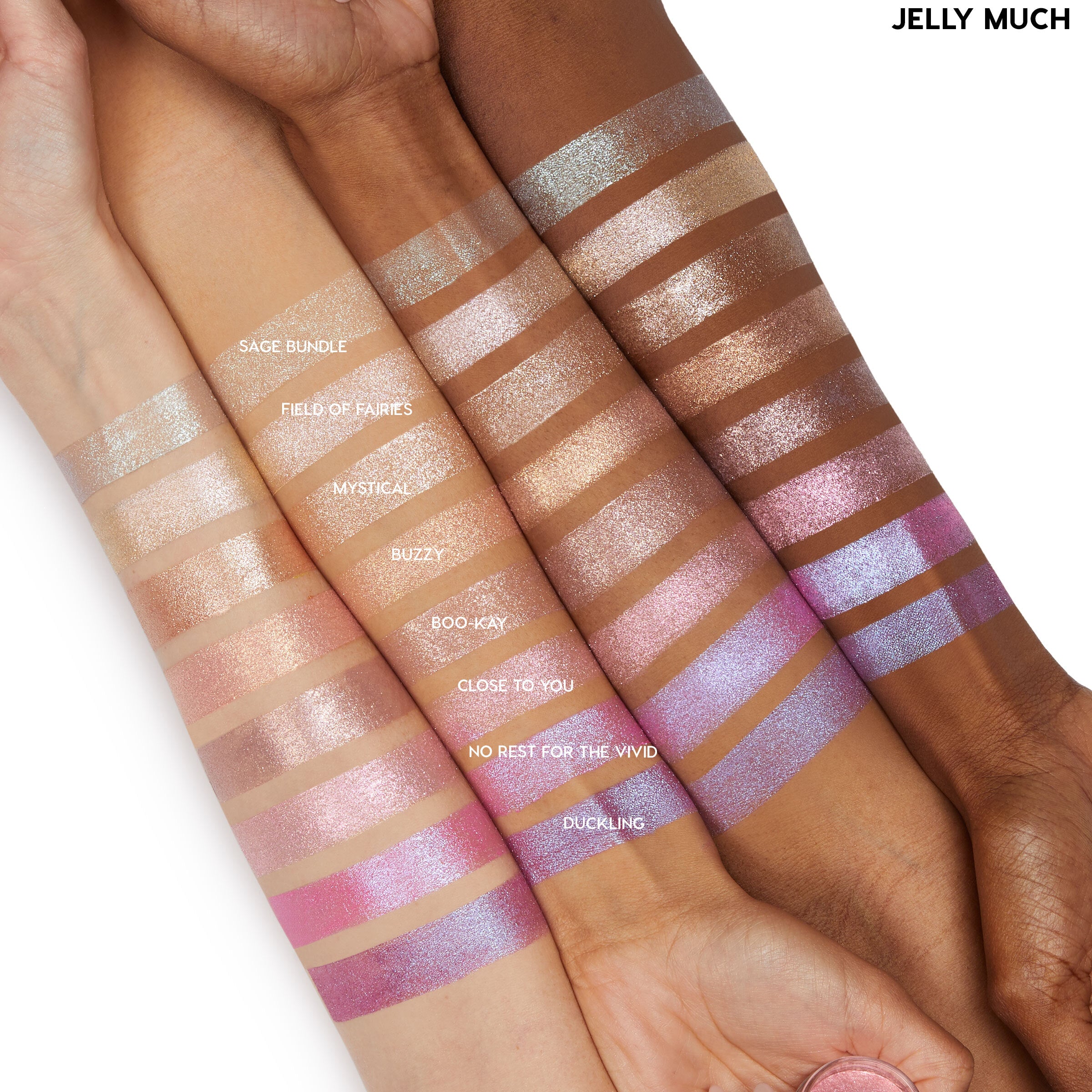 ColourPop Jelly Much Shadow Field of Fairies swatches sweep across three forearms, labeled Super Cool, Hallucinogenius, Big Ego, Shiny Penny, Brentwood, Billionaire, Stargaze, and Emo Inside, spanning icy blue, lilac, copper, lime, electric blue, and deep purple sparkle.