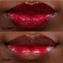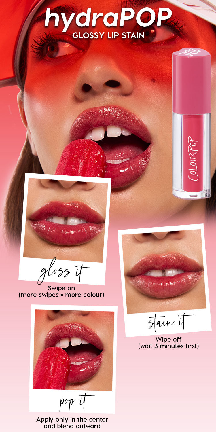 Colourpop hydraPOP glossy lip stain shown on a model with rich burgundy-red lips, holding the Colourpop tube, with close-up before-and-after shots demonstrating how the high-shine gloss applies smoothly and then softly stains as it fades.