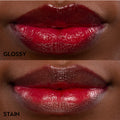 Fruit Punch ColourPop Lip Stain coating lips in a split macro swatch - top labeled Glossy shows a full-coverage, high-shine red, while bottom labeled Stain shows a sheer cherry tint after wear, highlighting shade payoff and finish comparison.