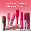Colourpop Blueberry Marg lip stain from the Hydra Pop collection standing among other glossy lipstick & lip stains in pink and berry tubes, under bold text reading “Glossy shine. Soft stain.” against a pink gradient background.