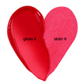Fruit Punch ColourPop Lip Stain swatch shaped like a heart, left side glossy cherry red labeled 'gloss it', right side matte hot pink labeled 'stain it', on a white background.