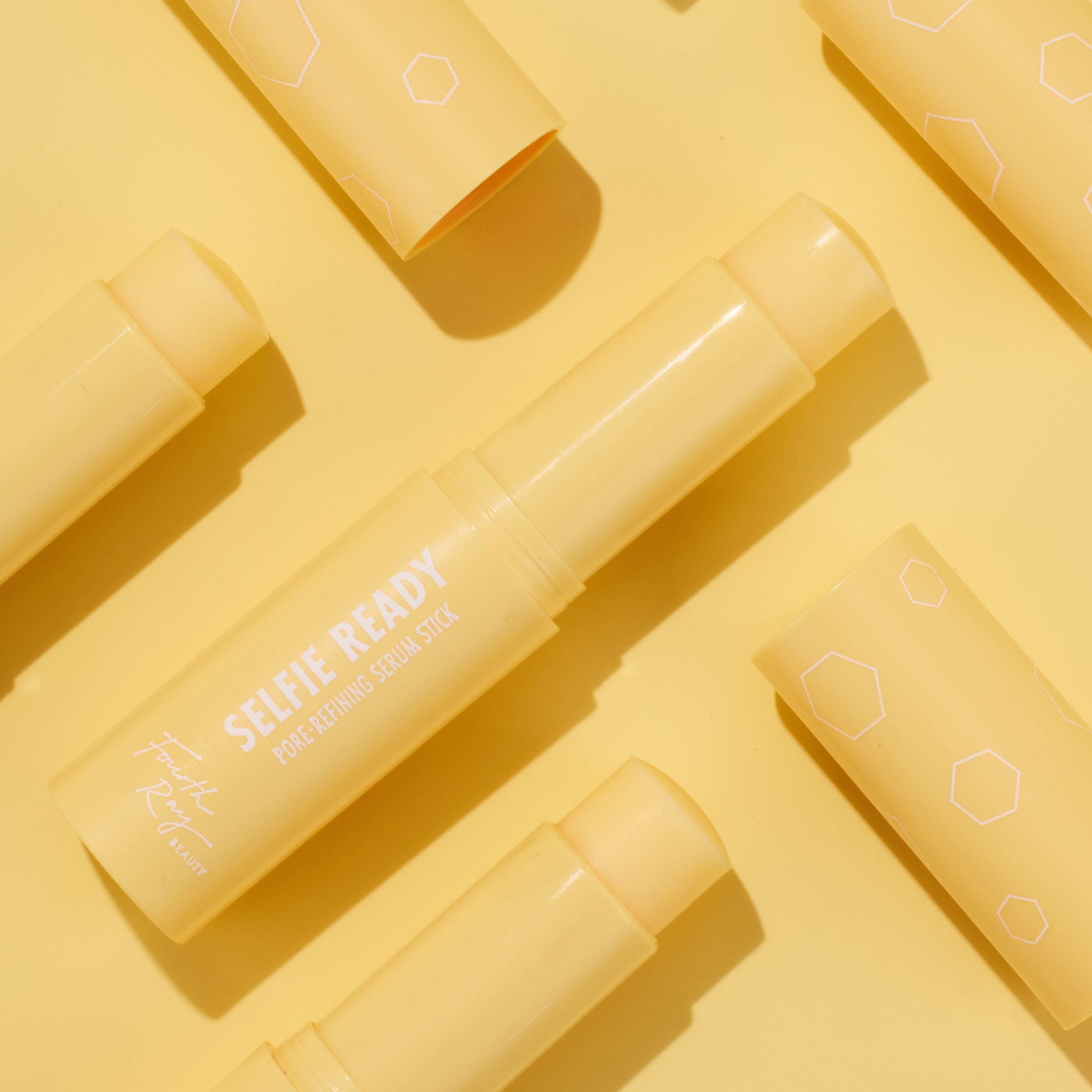 Selfie Ready pore-refining serum stick by Fourth Ray Beauty stands uncapped, revealing a rounded balm tip; pale yellow twist-up tube with white hexagon graphics and matching cap set beside it on a white background, ColourPop Serum Stick.