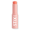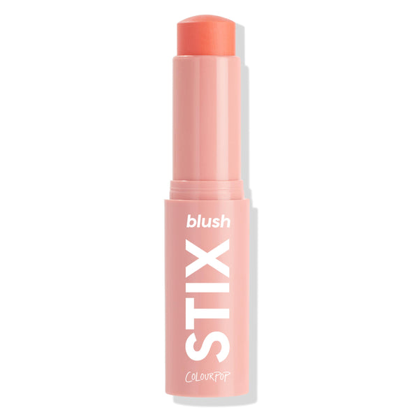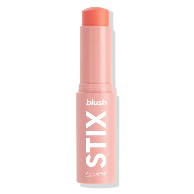 Under Pressure ColourPop Blush Stix standing uncapped, revealing a warm coral cream blush bullet in a blush-pink tube with bold white STIX branding, shown upright on a clean white background.